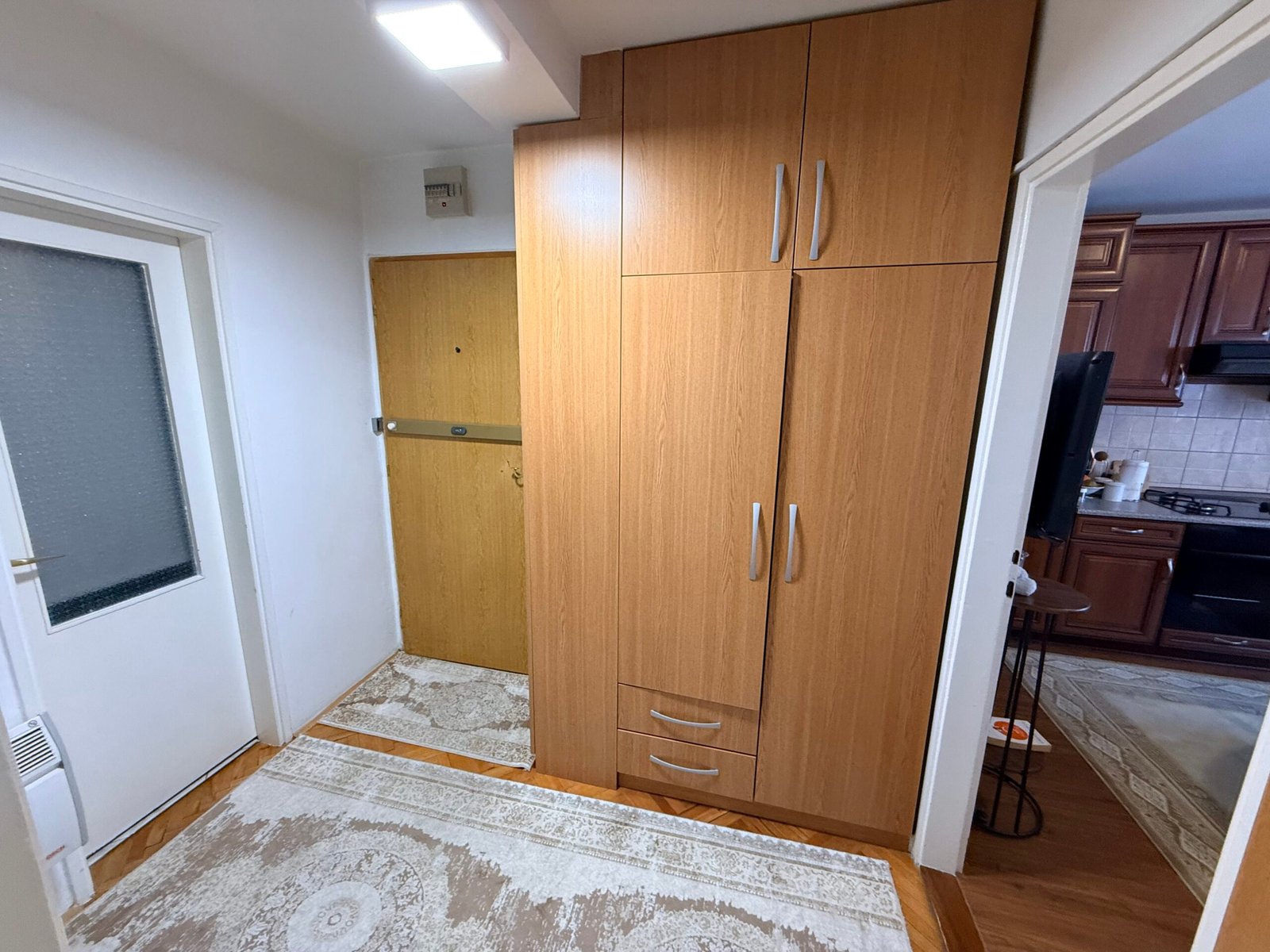 Stan se sastoji od ulaznog hodnika, dnevnog boravka sa izlazom na balkon koji gleda direkt na bulevar, kuhinje sa trpezarijom, špajza, spavaće sobe i kupatila.