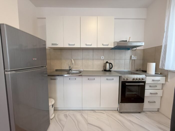 Kuhinja je gotovo nova, sa električnim uređajima, bez tragova korištenja, svega nekoliko puta se ručak napravio, dakle nova kuhinja sa napom i frižiderom.