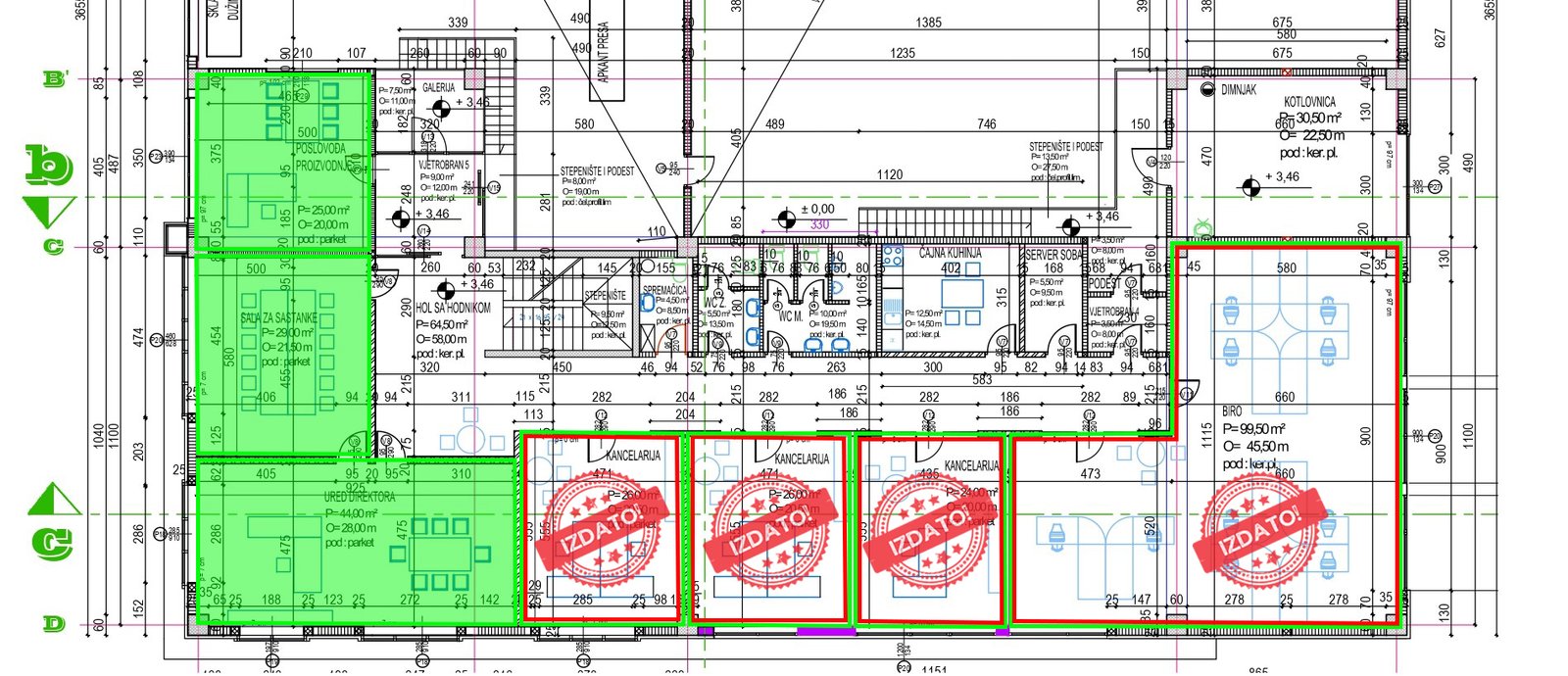 Postoji mogućnost izdavanja i pojedinačno svake kancelarije posebno ili spajanje jedne ili više kancelarija u zavisnosti od potreba zakupaca.
