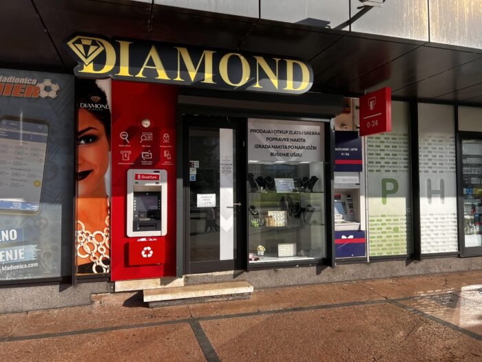 Prostor ima velike staklene portale i izlog koji gleda na šetačku zonu.